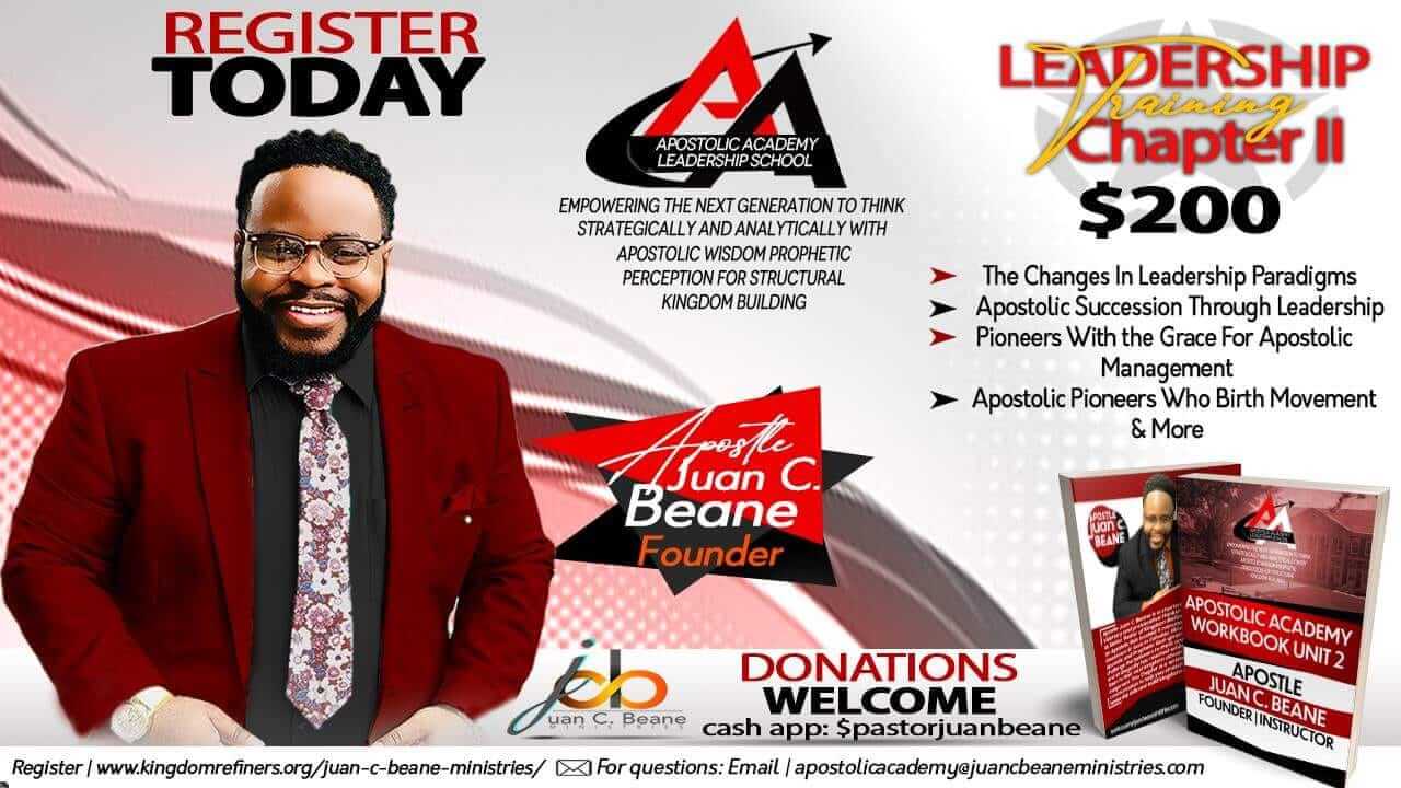 Apostle Juan C. Beane mentors and lead others with evidence during his weekly services, multiple annual training forums, which equips those between the ages of 19-39, while assisting those over 40 that are looking to gain and expand more and master other areas of ministry. He has lent his Prophetic voice and intellectual insights to the region and has advised Pastors and Leaders.